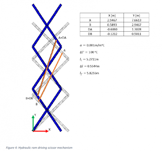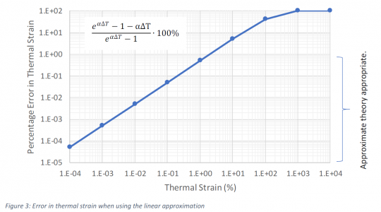 The practising engineer will probably be familiar with the idea of thermal expansion or contraction of structural members or mechanical components. If this deformation is constrained then stresses will be induced in the member or component. In finite element (FE) analysis the idea of thermal expansion/contraction can be used as a rather straightforward device to model a number of phenomena. The interference fit between rotating components, for example, is a good example where the standard small thermal strain approximation is generally appropriate. There are other cases where the use of the small thermal strain approximation can lead to significant errors. For example, the extension/contraction of a hydraulic ram can be modelled as an axial element with temperature change used to control the ram length. In this case it is necessary to adopt the proper thermal strain equation in order to obtain accurate results in an FE model which includes large displacements and rotations. This technical note reminds readers of the difference between the small and large thermal strain theories and presents examples where small strain theory is appropriate and where large strain theory is required to obtain the correct solution.